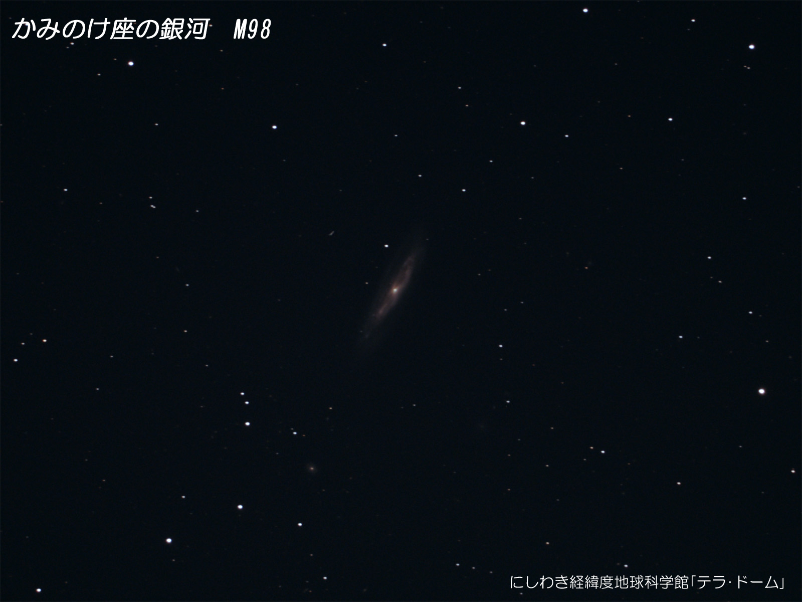 かみのけ座の銀河 M98 おとめ座銀河団に属する渦巻銀河です。渦巻きを斜めから見た形で、腕の部分にある暗黒帯が見えています。地球からの距離は約6000万光年です。 12.8p屈折望遠鏡(fl=770mm F=6.0 1540mm相当にトリミング) 赤外改造デジタルカメラ ISO1600 2分露出を16枚合成 撮影地:西脇市住吉町 撮影日:2026年2月24日 撮影者:高原 摂竜(地球科学館) |