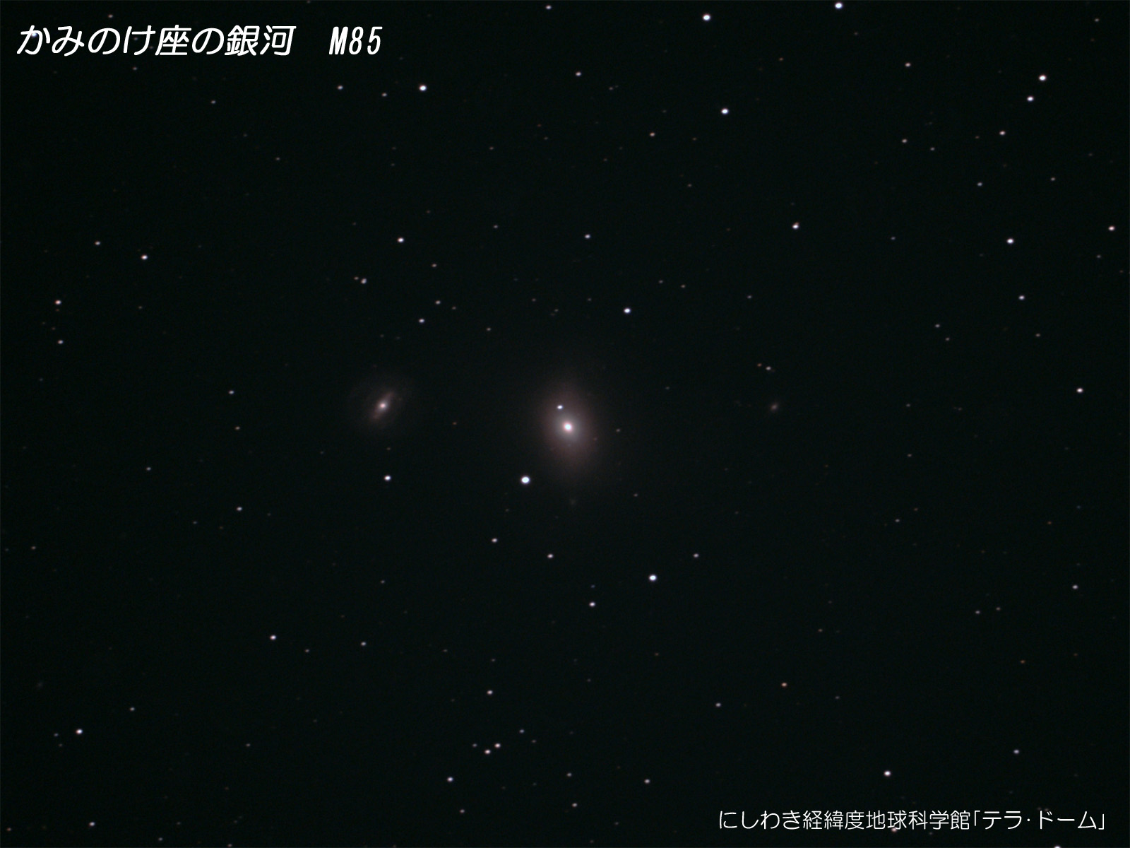かみのけ座の銀河 M85 かみのけ座にある銀河ですが、おとめ座銀河団の北の端にあたります。レンズ状銀河分類されていますが、楕円形であまり特徴がありません。すぐ隣には、棒渦巻銀河のNGC4394が並んでいます。 12.8p屈折望遠鏡(fl=770mm F=6.0 1540mm相当にトリミング) 赤外改造デジタルカメラ ISO1600 2分露出を15枚合成 撮影地:西脇市住吉町 撮影日:2026年2月21日 撮影者:高原 摂竜(地球科学館) |