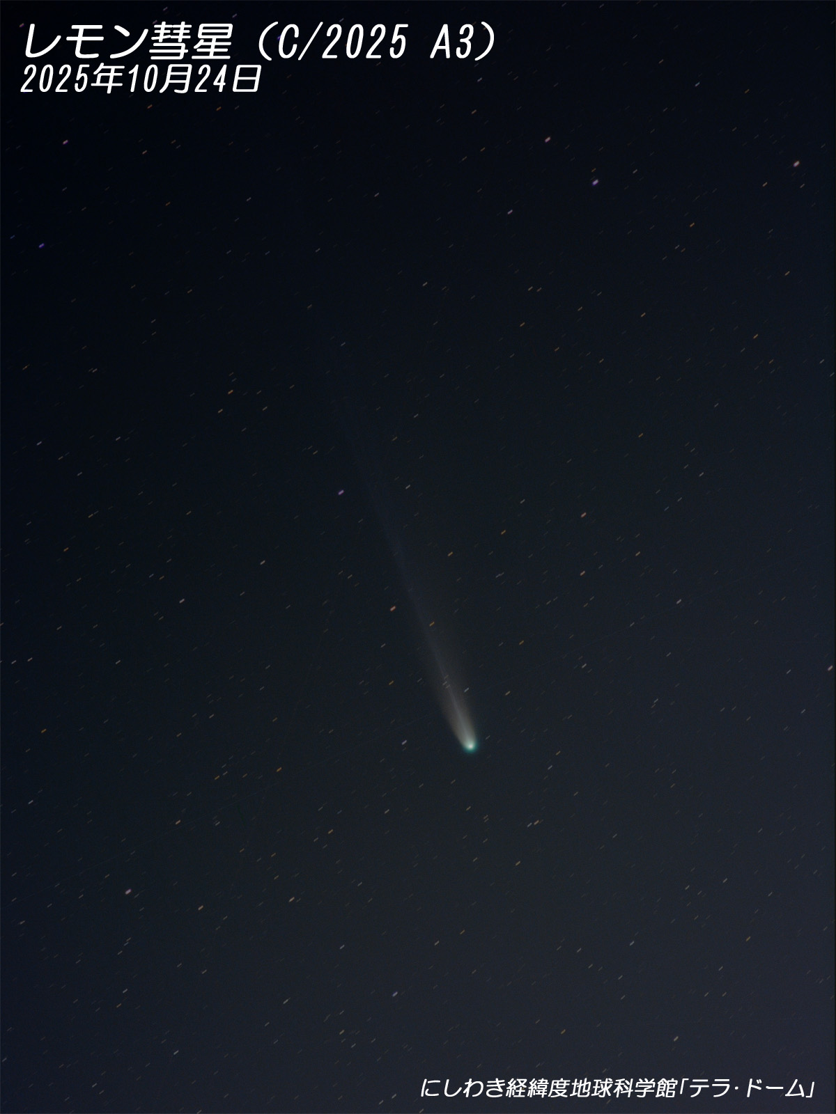 レモン彗星(C/2025 A3) 2025年10月24日 レモン彗星を中望遠レンズで追尾撮影してみました。 緑色のコマと幅広いダストの尾、細く伸びるイオンの尾が伸びているのがわかります。 180mm F=4.0 ISO800 30秒露出を15枚コンポジット 撮影地:日本へそ公園内 撮影者:高原 摂竜(地球科学館) |