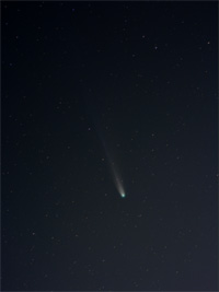 池谷・張彗星(2002年3月13日) 3月13日、西脇周辺は、昼間から雲ひとつないすばらしい天気に恵まれました。観測地に到着してすぐに手持ちの双眼鏡で彗星を見てみると、6日よりもさらにはっきりとした尾を引いていました。大型の双眼鏡では、明るく光る核を取り巻く緑色のガスと、6日にはあまり見られなかった白いダストの尾がよく見え、1997年2月ごろのヘール・ボップ彗星を小さくしたような印象を受けました。写真でも、かなり尾が明るくなって、のびていることがわかりますね。 10p屈折望遠鏡(Fl=400mm F=4.0) ASA800ネガフィルム 10分露出 撮影地:兵庫県氷上郡青垣町 撮影者:高原 摂竜(地球科学館) |