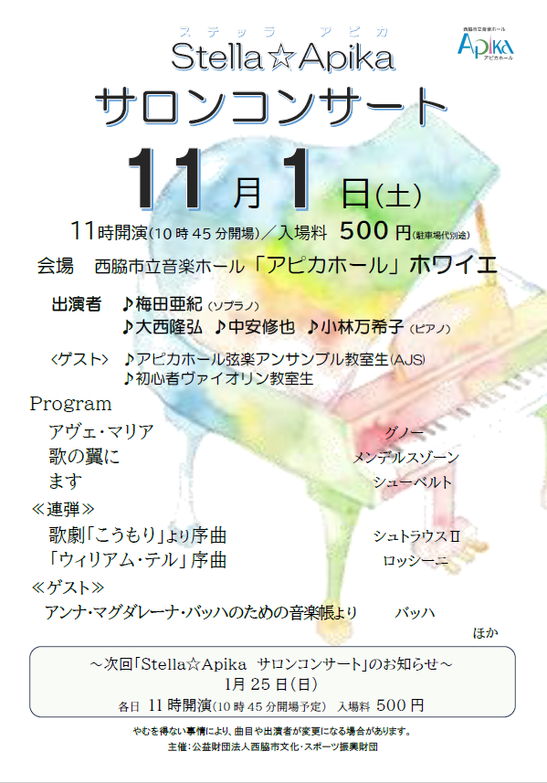 アピカホールのホワイエでお客様と近い距離の コンサートです。 今回は歌とピアノに加え、 アピカホール弦楽アンサンブル教室生、 初心者ヴァイオリン教室生がゲスト出演します。