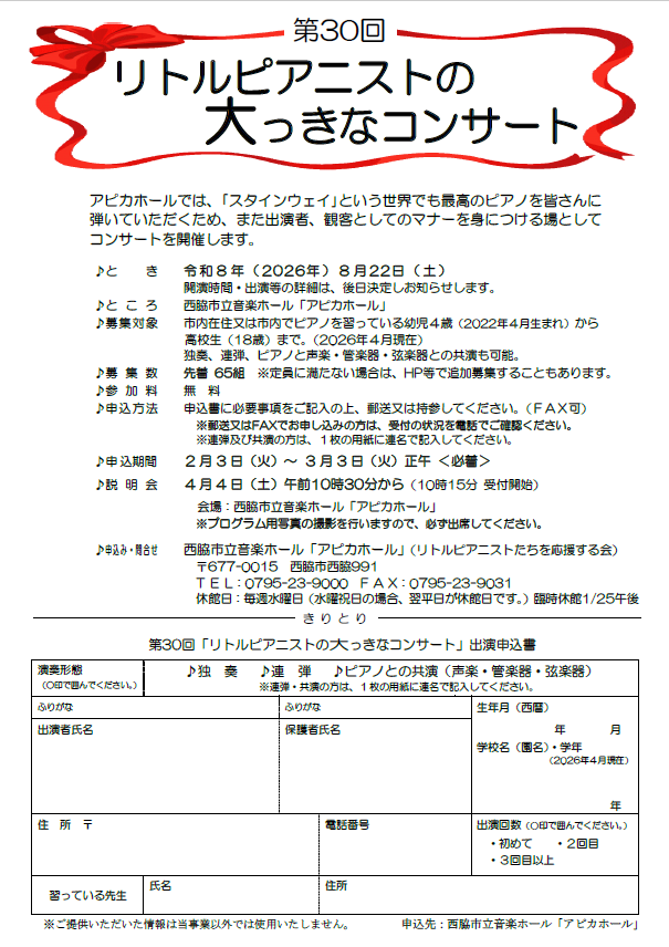 出演者募集! コンサート開催日 2026年8月22日(土) 開演時間は後日お知らせいたします 出演者募集期間 2月3日~3月3日 ↓↓詳しくはこちらをご覧ください↓↓↓