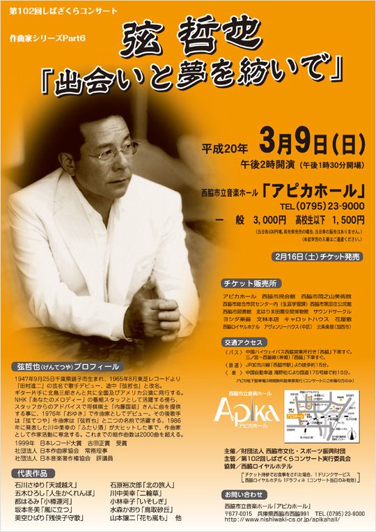 緊急企画! 【日 時】平成20年3月9日(日) 午後2時開演(午後1時30分開場) 【入場料】一般 3,000円 高校生以下 1,500円 (当日は500円増 前売券完売の場合は、当日券はありません。) チケットは完売いたしました。