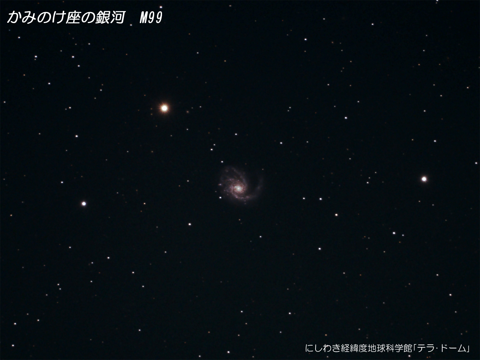 かみのけ座の渦巻銀河 M100 しし座のしっぽに輝く2等星レグルスと、北斗七星の脇に光るりょうけん座のコルカロリを結ぶ線上に、たくさんの星が集まって光っている部分があります。この星の集まりが、かみのけ座です。かみのけ座にはたくさんの銀河があつまっていて、M100もそのひとつです。望遠鏡でも淡く広がる腕を見るのはむずかしいのですが、写真では渦巻銀河を上から眺めた姿がよくわかります。地球からの距離は、約4000万光年です。 12.8p屈折望遠鏡(fl=770mm F=6.0 1540mm相当にトリミング) 赤外改造デジタルカメラ ISO1600 2分露出を21枚合成 撮影地:西脇市住吉町 撮影日:2026年2月20日 撮影者:高原 摂竜(地球科学館) |