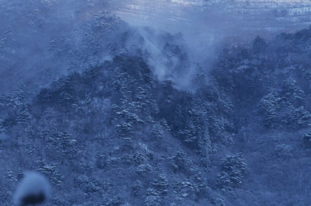 千ケ峰冬景色 雪の津万平野を撮影した同日、久しぶりに千ケ峰山頂からの白銀の世界を見たくて車を走らせました。写真は市原登山道から撮影した山腹で、谷から吹き上げる風により、雪煙が音を立てながら舞う情景はまるで墨絵のようでした。 撮影地:兵庫県多可郡加美町 撮影者:本田 則幸(地球科学館) |